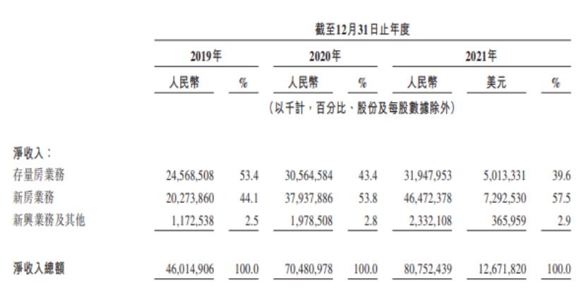 该公司的收入主要来自房产交易和服务的收费和佣金。公司净收入由2019年的人民币460.15亿元增加53.2%至2020年的人民币704.81亿元,并进一步增加14.6%至2021年的人民币807.52亿元(126.72亿美元),主要由于总交易额由2019年的人民币2.13万亿元大幅增至2020年的人民币3.50亿元,并进一步增至2021年的人民币3.85万亿元,导致新房业务及存量房业务的收入增加所致。