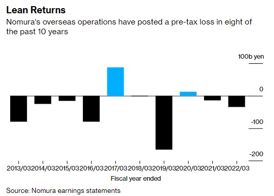过去10年,这项业务平均贡献了野村年营收的四分之一以上。其中8年,这家券商的海外业务出现亏损。