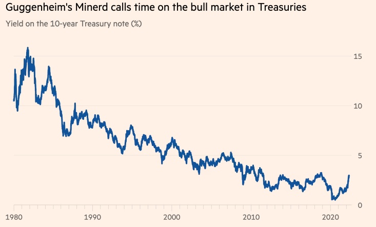 古根海姆首席投资官Scott Minerd表示,美国国债的长期牛市已经结束,他警告称,随着美联储收紧货币政策以对抗通胀,美债收益率或开启“长达一代人”上涨周期。