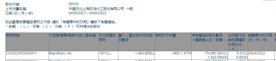 智通财经APP获悉,香港联交所最新资料显示,4月29日,贝莱德增持上海石油化工股份(00338)136.4万股,每股作价1.4779港元,总金额约为201.59万港元。增持后最新持股数目约为1.75亿股,最新持股比例为5.01%。