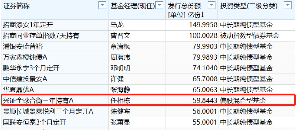 数据显示,发行总份额前十的名单中,除了排名第八位的兴证全球基金旗下任相栋管理的兴证全球合衡三年持有A是唯一一只偏股混合型基金外,其余皆为债券型基金。