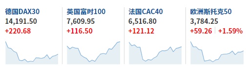 2. 截至发稿,德国DAX指数涨1.59%,英国富时100指数涨1.56%,法国CAC40指数涨1.89%,欧洲斯托克50指数涨1.59%。