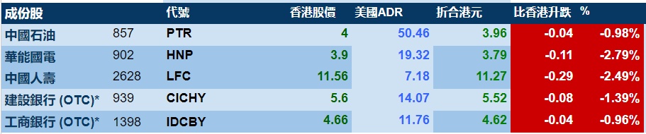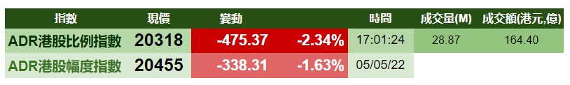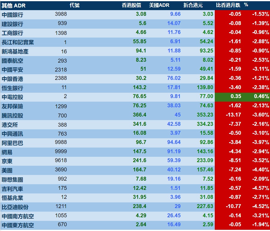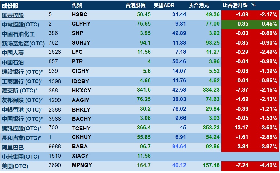 智通财经APP获悉,周四美股三大指数悉数下跌,港股ADR指数下跌,按比例计算,收报20318点,较香港收市跌475.37点或2.34%。