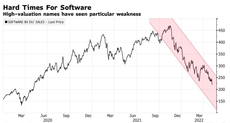 美股软件板块遭受了自2020年3月以来的最大打击,因为投资者避开了该板块中高估值公司,这些公司尤其容易受到利率上升和经济增长放缓的冲击。