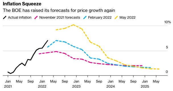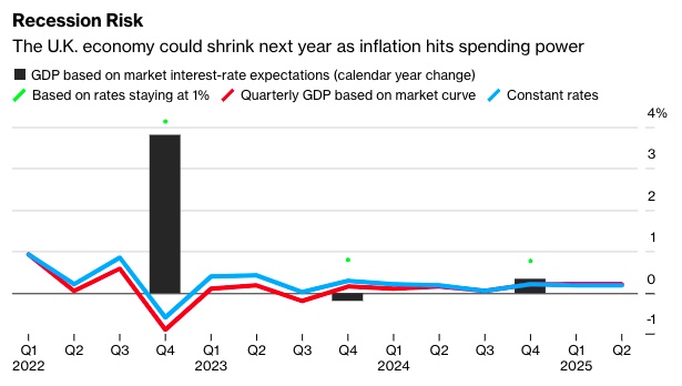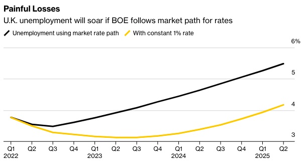 根据市场假设,利率将在明年年中攀升至2.5%,央行预测经济将在2023年萎缩,在2024年停滞。央行预计,这可能会使失业率从3.8%跃升至5.5%。