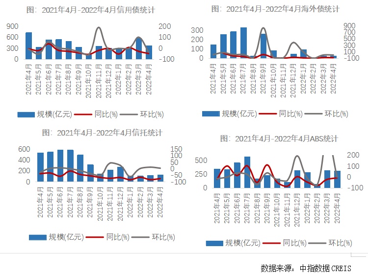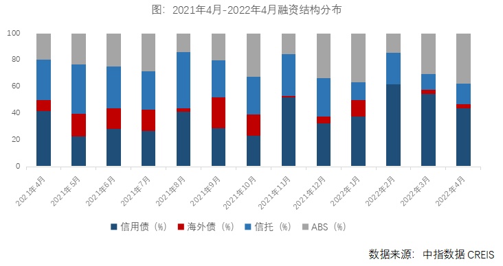 从融资结构来看,4月信用债规模占比43.7%,海外债占比3.4%,信托融资占比15.3%,ABS融资占比37.6%。