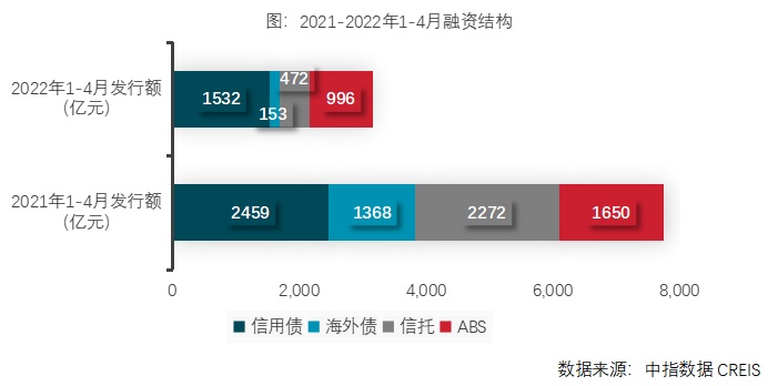 2022年1-4月,房地产企业非银融资总额3152.4亿元,同比下降59.3%。从融资结构来看,信用债占比48.6%,同比提升16.9个百分点;海外债占比仅为4.9%,同比下降12.8个百分点;信托占比15.0%,同比下降14.3个百分点;ABS占比31.6%,同比提升10.3个百分点。