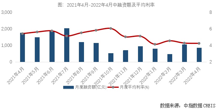中指研究院监测,2022年4月房地产企业非银融资总额为843.4亿元,同比下降52.1%,环比下跌19.7%,未能延续3月的千亿势头。行业平均利率为4.23%,同比下降1.17个百分点,环比基本持平。信用债发行回落是融资总额环比下降的主要原因。