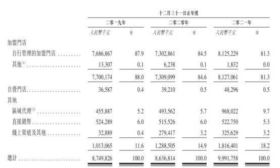 从招股书看来,各加盟店也为公司带来了不错的收益。于报告期内,来自加盟门店的收入分别76.87亿元、73.03亿元及81.25亿元,收入占比超80%。