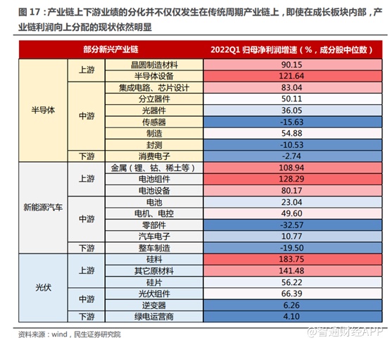 业绩期刚落下帷幕,从刚过去的一季度业绩披露来看,产业链的利润向上分配的现状依然明显。从半导体、新能源车与光伏的产业链利润增速可以看出,上游业绩增速普遍在100%以上,景气度显著高于中下游。