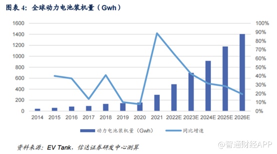 假设2025年新能源车渗透率达到30%,即每年销售2400万辆新能源车,平均每辆车50KWh装机,则2025年新能源车动力电池需求将达到1200GWh。信达证券也预计 2022-2026 年CAGR将达30.1%,到 2025 年全球动力电池将进入Twh时代。