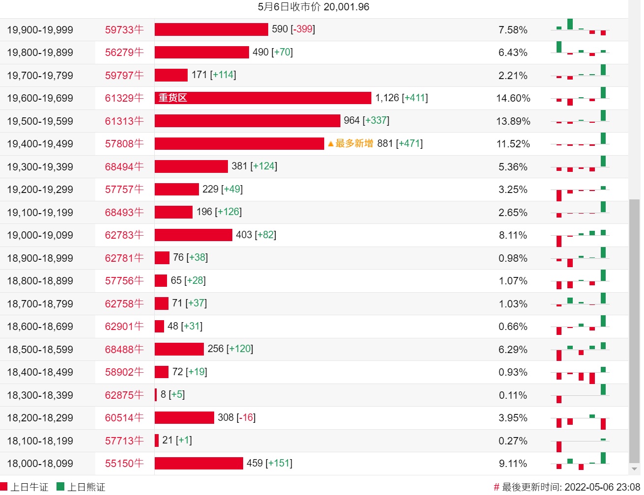 牛证街货重货区在19600-19699区间,该区间最新牛证数量为1126张,较上一交易日增加411张;最多新增在19400-19499区间,该区间最新熊证数量为881张,较上一交易日增加471张。