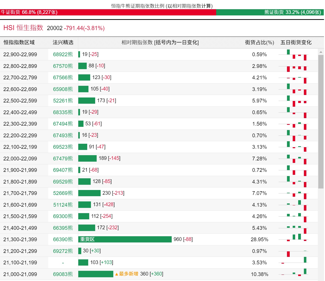 法兴恒指牛熊证街货分布图中的数据显示,熊证街货重货区在21300-21399区间,该区间最新熊证数量为960张,较上一交易日减少88张;最多新增在21000-21099区间,该区间最新熊证数量为360张,较上一交易日增加360张。