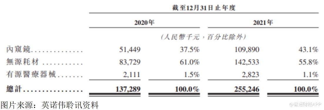 英诺伟专注于非血管介入手术产品的研发,主要产品包括内窥镜、无源耗材及有源医疗器械产品,前两个为核心产品,贡献了近100%的收入份额。该公司仅披露过去两年的业绩,2021年两大核心产品均获得较高的增长,收入分别增长114%及70.25%,收入贡献分别为43.1%及55.8%。
