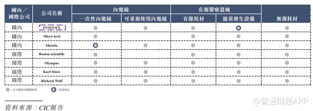 根据聆讯资料,在无源耗材上,在中国仅有四家制造商开发出覆盖所有主要进行非血管介入手术的医学专科的无源耗材,其中该公司是唯一一家国内制造商。而在有源医疗器械上,该公司提供的一次性电圈套器和等离子能量手术设备可能是全球及中国首款适用于消化科介入手术的医疗器械。