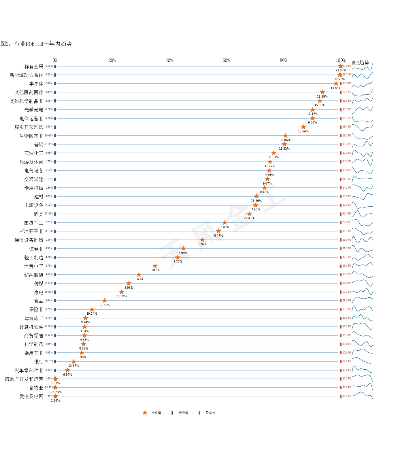 目前,稀有金属、新能源动力系统、半导体的ROETTM处于过去十年的高点,发电及电网、畜牧业、房地产开发和运营的ROETTM处于过去十年的低点。