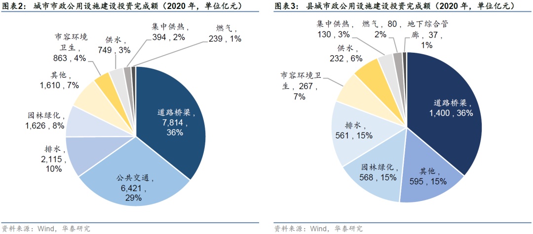 对比县城与城市看,(1)人口方面,2021年年底我国城镇常住人口为9.1亿人,其中县城(含县级市)为2.5亿人左右,占比城镇总人口约27%;(2)经济体量方面,县城占全国GDP约40%;(3)消费方面,县城人均消费支出为城市的2/3左右,占城镇总消费支出约20%;(4)投资方面,县城人均市政公用设施投资为城市的1/2左右,占城镇总市政投资约15%。据统计局,2020年我国县城的市政公用设施投资完成额为3884亿元,占全社会固定资产投资总额约0.7%,其中县城的道路桥梁(36%)、园林绿化(15%)和排水(15%)投资占比较高,合计近七成。