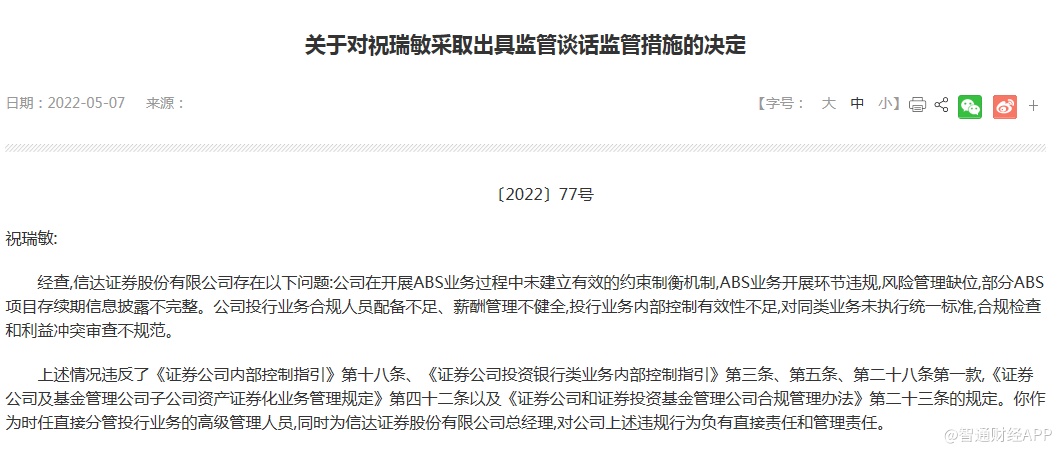 智通财经APP获悉,5月7日,中国证监会北京监管局对信达证券股份有限公司总经理祝瑞敏采取出具监管谈话监管措施。