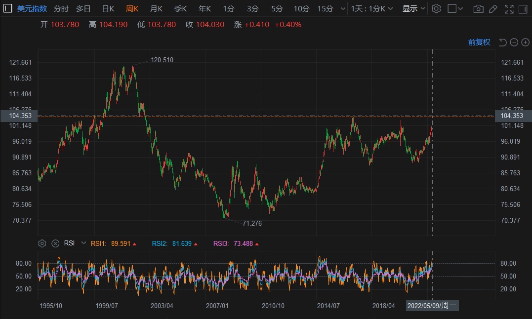 截至发稿,10年期美债收益率涨1.27%至3.179,继上周五之后续创2018年10月以来的新高,今日盘中一度飙升至3.181%。美元指数继续站上104关口,今日一度升至104.190,续创2002年12月以来的最高水平。