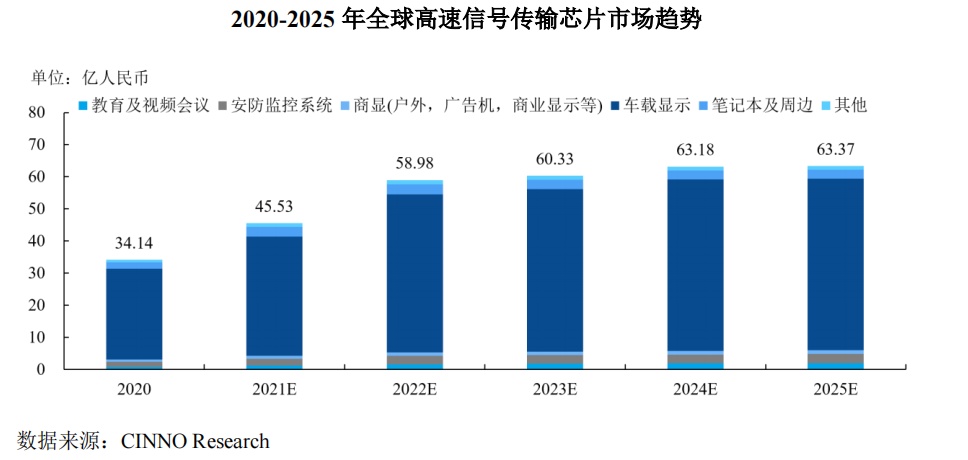 其中,国内高速信号传输芯片市场规模,受益于车载显示等下游领域的发展,预计至2025年国内高速信号传输芯片市场规模预计将达到15.69亿元,2020-2025年复合增长率约15.91%,整体增速高于全球市场。