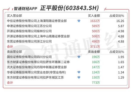 正平股份(603843.SH):龙虎榜阵容豪华,机构席位卖出134万元,买一是知名一线游资孙哥的席位净买入1632万元,买五是知名游资苏南帮的席位买入490万元,当日净买入2938万元,该股今日底部缩量首板,突破20日线需要补量。