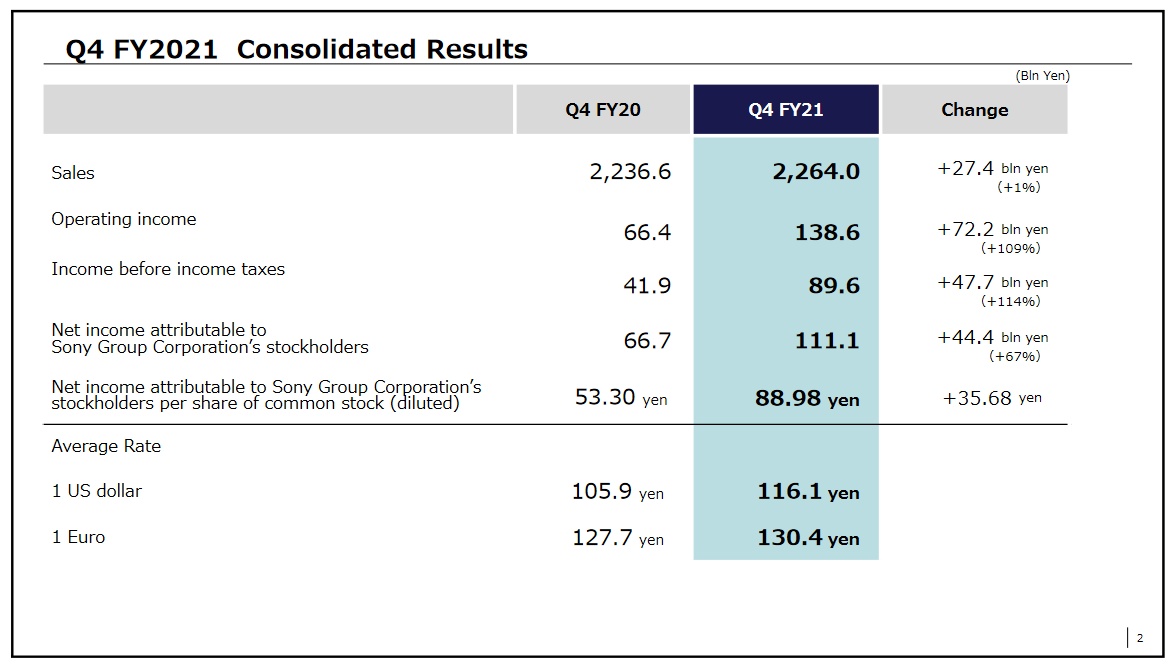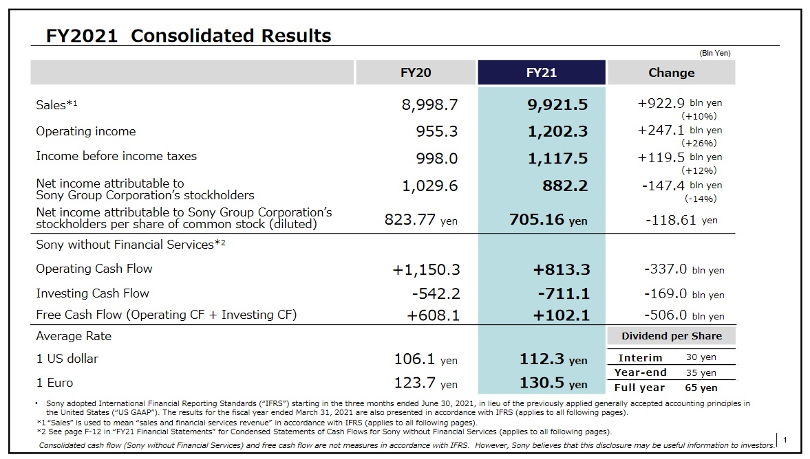 2021财年全年,索尼销售额为9.92万亿日元,同比增长10%;归属于公司股东的净利润为8822亿日元,同比下降14%;摊薄后每股收益为705.16日元,上年同期为823.77日元;营业利润为1.20万亿日元,同比增长26%。