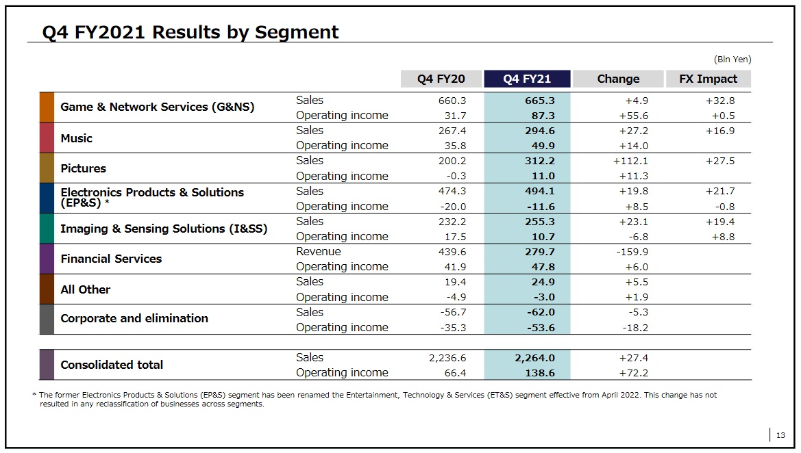 按业务划分,游戏及网络服务业务(G&NS)销售额为6653亿日元,上年同期为6603亿日元;音乐部门销售额为2946亿日元,上年同期为2674亿日元;影视部门销售额为3122亿日元,上年同期为2002亿日元;电子产品与解决方案业务(EP&S)销售额为4941亿日元,上年同期为4743亿日元;图像与传感解决方案业务(I&SS)销售额为2553亿日元,上年同期为2322亿日元;金融服务营收为2797亿日元,上年同期为4396亿日元。