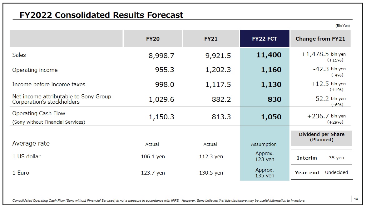 索尼表示,预计2022财年销售额将同比增长15%至11.4万亿日元;预计归属于公司股东的净利润同比下降6%至8300亿日元(低于市场预计的8370亿日元);预计营业利润同比下降4%至1.16万亿日元(同样低于市场预计的1.2万亿日元)。此外,索尼宣布将回购最高达2000亿日元(约合15亿美元)的公司股票。