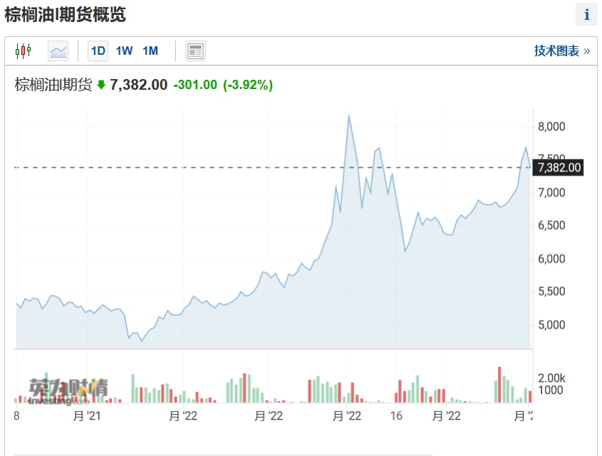截至发稿,马来西亚吉隆坡7月交割的棕榈油期货跌3.92%,至7382林吉特/吨。
