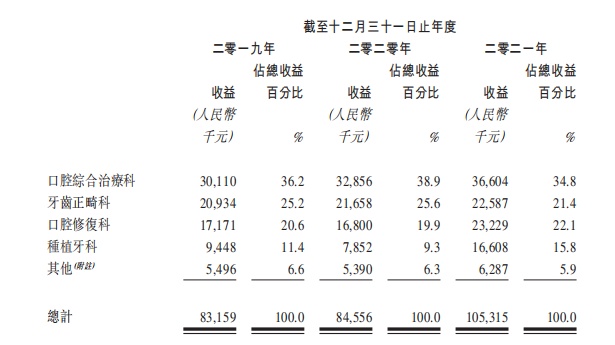 业务方面,报告期内,口腔综合治疗科收入分别为3011万元、3285.6万元、3660.4万元,分别占总收益的比例约36.2%、38.9%及34.8%;牙齿正畸科的收入分别为2093.4万元、2165.8万元、2258.7万元,分别占总营收的25.2%、25.6%及21.4%;口腔修复科的收入分别为1717.1万元、1680.0万元、2322.9万元,分别占总营收的比例分别为20.6%、19.9%、22.1%;种植牙科的收入分别为944.8万元、785.2万元、1660.8万元,分别占总收益的比例分别为11.4%、9.3%、15.8%。口腔综合治疗科和牙齿正畸科产生的收入虽呈现增长态势,但增幅较低(约10%左右),可见占比近六成的两项主营业务的天花板已然逼近,想象空间不足。而种植牙科于2021年营收涨幅高达111.5%,为过亿营收助力。