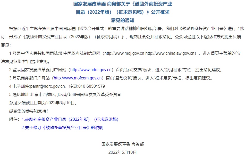 根据习近平主席在第四届中国国际进口博览会开幕式上的重要讲话精神和国务院部署,2021 年 11 月以来,国家发展改革委会同商务部在广泛征求各地方、各有关部门、商协会、企业意见基础上,形成了《鼓励外商投资产业目录(2022 年版)(征求意见稿)》。