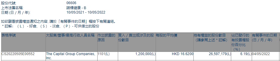 智通财经APP获悉,香港联交所最新资料显示,5月4日,美国资本集团增持诺辉健康-B(06606)120万股,每股作价16.62港元,总金额为1994.4万港元。增持后最新持股数目约为2659.72万股,最新持股比例为6.19%。