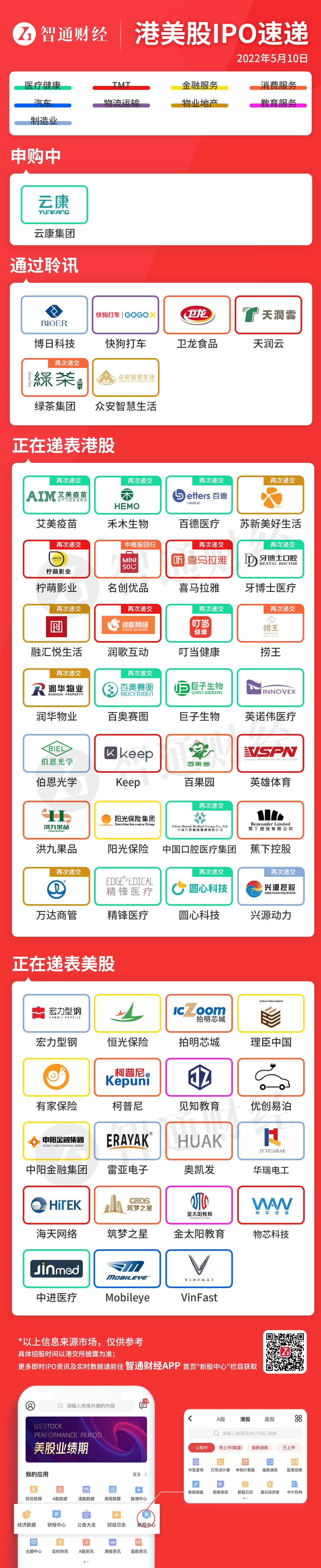 智通财经5月最新港美股IPO速递发布,其中,云康集团(02325)正在招股中;众安智慧生活、卫龙食品、快狗打车、绿茶集团、博日科技、天润云已通过港交所聆讯。