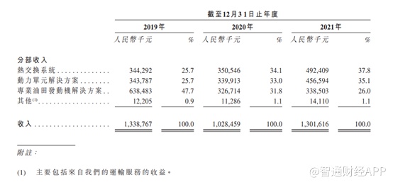 分业务来看,2019年公司主要收入来源为专业油田发动机解决方案,收入达到6.38亿元,占营业收入的47.7%,2020年该业务收入大幅下滑导致2020年收入降低。不过热交换系统和动力单元解决方法业务稳步提升,使得2021年收入有所恢复。2021年热交换系统收入4.92亿元,同比增长40%;动力单元解决方案4.57亿元,同比增长34%。