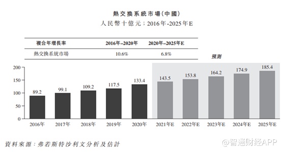 按收入计算,中国的热交换系统市场2020年市场规模约为1334亿元,沙利文预计未来,至2025年该市场规模将达到1854亿元,2020年至2025年复合年增长率为6.8%。
