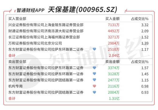 天保基建(000965.SZ):多主力现身龙虎榜,机构席位与游资产生分歧,当日对倒买卖均衡,买一是知名游资的席位净买入7108万元,当日净买入1.59亿元,近期明显多头排列,预计有溢价。