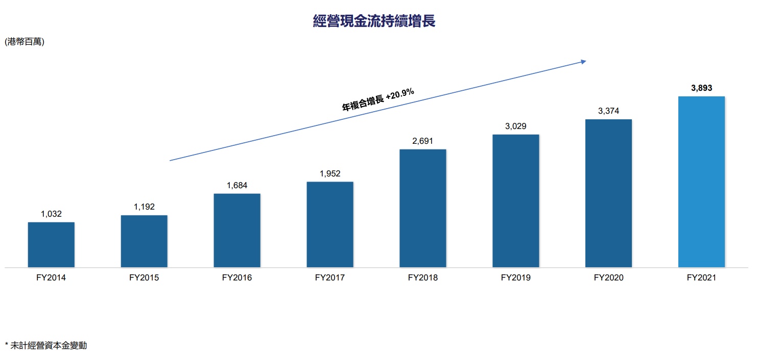 且得益于供水业务TOO永续经营的独特商业模式,中国水务拥有着良好现金流,其经营现金流从2014财年的10.32亿港元增至2021财年的38.93亿港元,年复合增速高达20.9%。