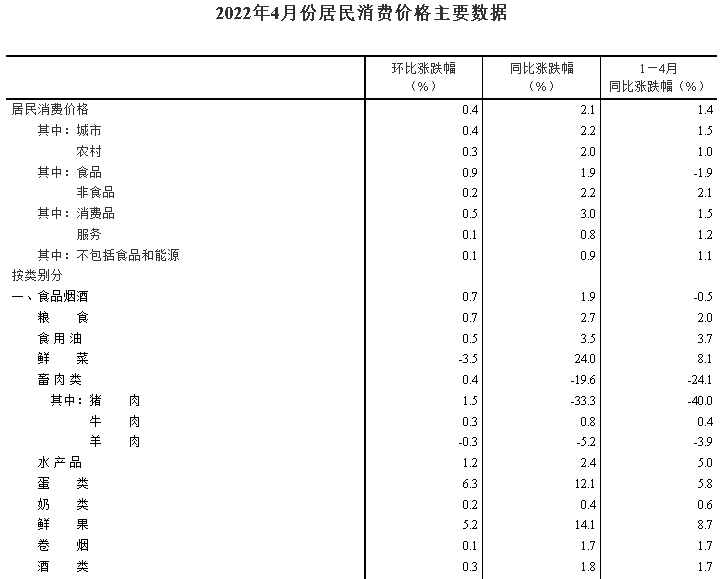 2022年4月份居民消费价格同比上涨2.1% 环比上涨0.4%