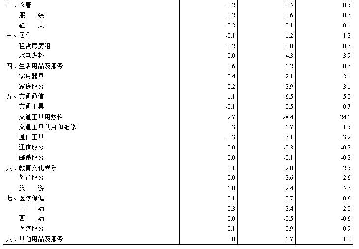 其他七大类价格环比四涨一平两降。其中,交通通信、生活用品及服务价格分别上涨1.1%和0.6%,教育文化娱乐、医疗保健价格均上涨0.1%;其他用品及服务价格持平;衣着、居住价格分别下降0.2%和0.1%。