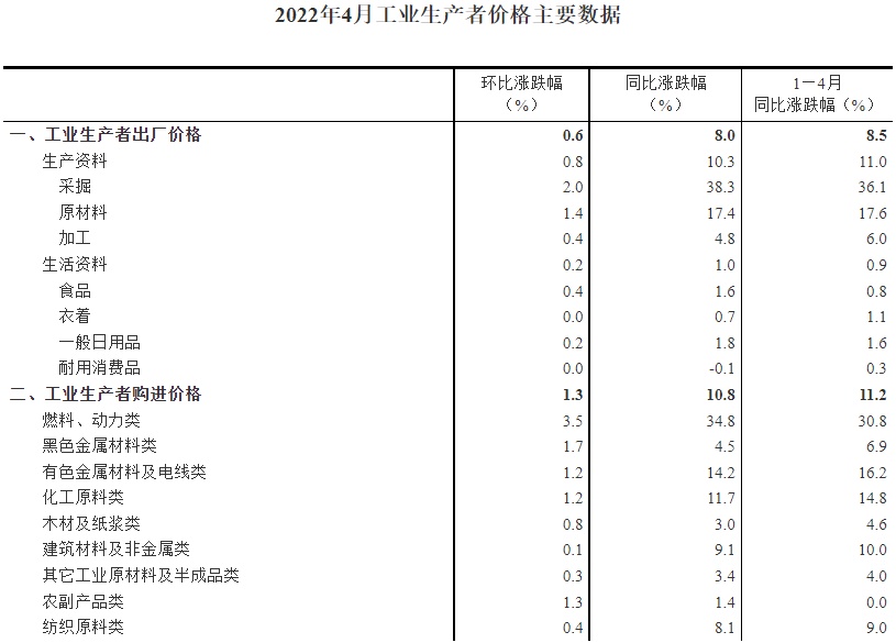 2022年4月份工业生产者出厂价格同比上涨8.0% 环比上涨0.6%