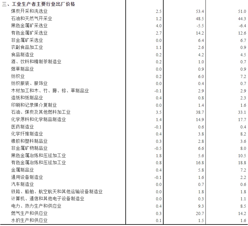 工业生产者出厂价格中,生产资料价格上涨10.3%,影响工业生产者出厂价格总水平上涨约7.78个百分点。其中,采掘工业价格上涨38.3%,原材料工业价格上涨17.4%,加工工业价格上涨4.8%。生活资料价格上涨1.0%,影响工业生产者出厂价格总水平上涨约0.23个百分点。其中,食品价格上涨1.6%,衣着价格上涨0.7%,一般日用品价格上涨1.8%,耐用消费品价格下降0.1%。