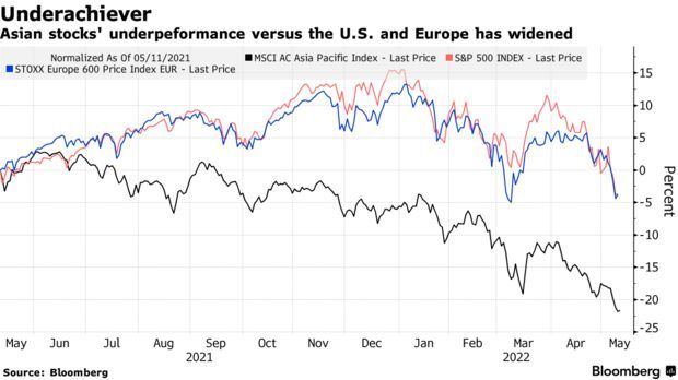 今年迄今为止,全球各大央行收紧货币政策的举措、通胀加剧以及疫情反弹,令亚洲股市可能在今年面临困境。在2022年前四个月的大幅下跌后,亚洲股市的市值已经蒸发了超过2万亿美元。