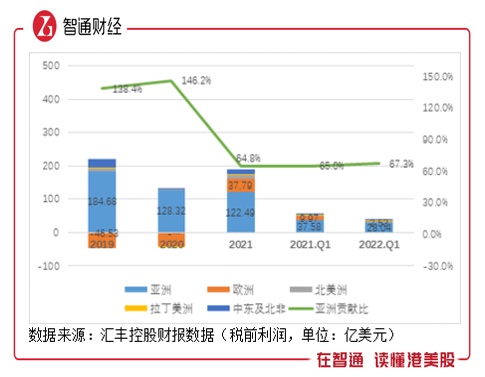 4月26日,汇丰发布的2022Q1财报显示,Q1列账基准除税前利润为42亿美元,亚洲地区占比67%。作为对比,2021年汇丰税前利润达189亿美元,其中亚洲业务贡献税前利润达122亿美元,占比达64.6%。仅仅三个月时长,亚洲贡献利润比例再上升2.4个百分点。