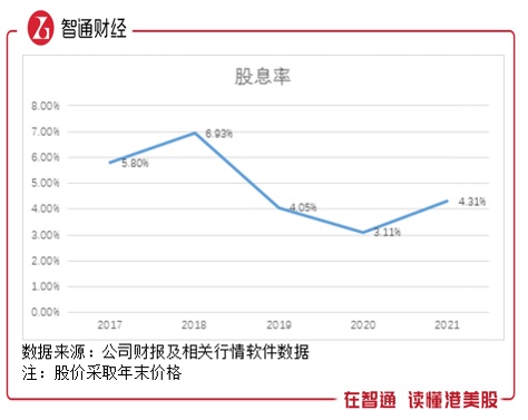 2020年由于疫情及监管原因,汇丰控股中断了2019年第四次派息,2020年仅有一次派息,2021年恢复至两次派息,期间业务全面实现盈利,股东净利润也创下了历史新高。从近五年派息水平看,股息率最高于2018年达到近7%,之后有所下滑,2021年为4.31%,仍高于银行定期存单。