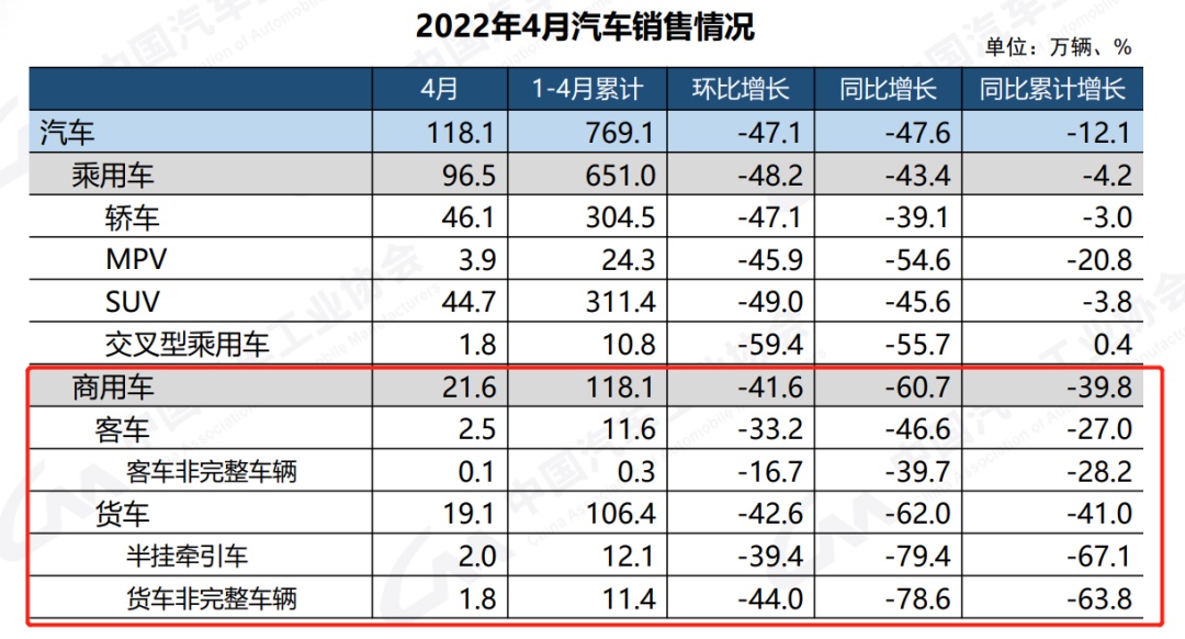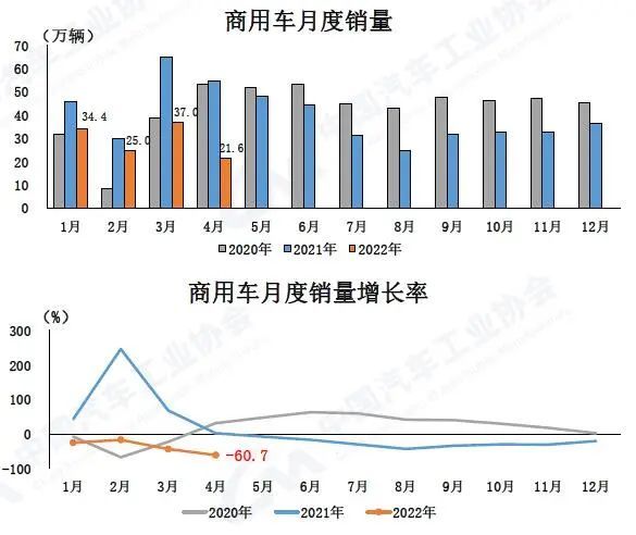 智通财经APP获悉,根据中国汽车工业协会发布的2022年4月汽车产销数据,4月商用车销21.6万辆,环比下降41.6%,同比下降60.7%。其中,重卡销4.4万辆,下降幅度最为明显;轻卡销10.7万辆,降幅也超5成。