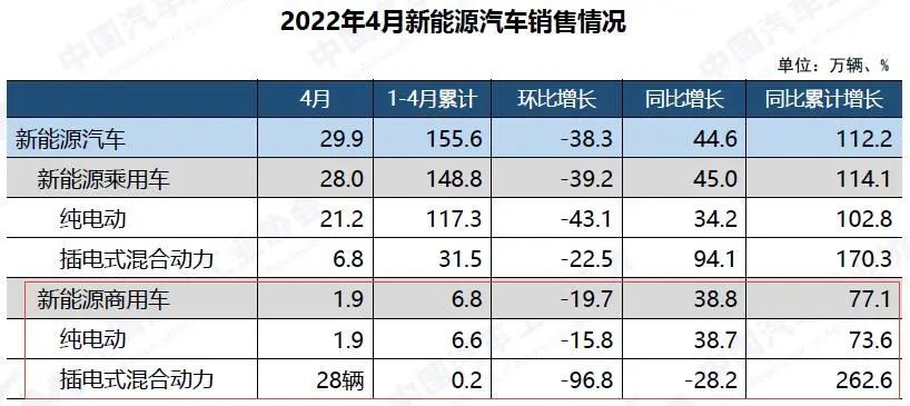 新能源方面依旧是为数不多的市场闪光点之一。4月,新能源汽车产销环比虽然有所下滑,但同比依然保持较快增长:4月产销分别达到31.2万辆和29.9万辆,环比下降33.0%和38.3%,同比增长43.9%和44.6%,市场占有率达到25.3%。1-4月,新能源汽车产销160.5万辆和155.6万辆,同比增长均为1.1倍,市场占有率达到20.2%。其中,4月,新能源商用车销1.9万辆,同比增长38.8%;1-4月,新能源商用车累销6.8万辆,同比增长77.1%。