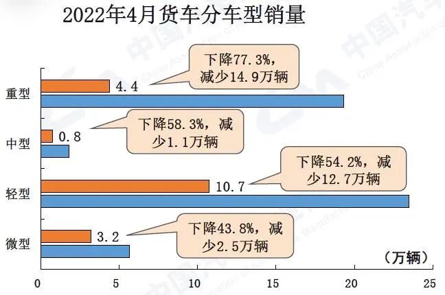 4月,重型货车销4.4万辆,较去年同期减少14.9万辆,同比下降77.3%;1-4月,重型货车累计销27.6万辆,同比下降61.9%;4月,轻型货车销10.7万辆,较去年同期减少12.7万辆,同比下降54.2%;1-4月,轻型货车累计销57.4万辆,同比下降19.6%。