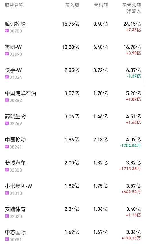 药明生物(02269)获净买入3.26亿港元。消息面上,国家发改委印发十四五生物经济发展规划提出,强化企业创新主体地位,要发挥生物领域龙头企业引领支撑作用,引导大企业向产业链上下游开放科技创新、供应链、金融服务等资源,推动与中小企业融通创新。围绕生物医药、生物农业、生物制造等规模大、影响广的重点领域,鼓励生物创新企业深耕细分领域,厚植发展优势,培育成为具有全球竞争力的单项冠军。