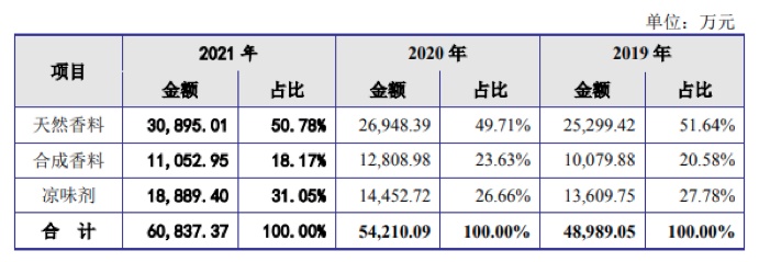 报告期内,公司天然香料产品收入金额呈上升趋势,分别为2.53亿元、2.69亿元及3.09亿元,为公司为贡献了五成收入,是公司的主要收入来源。此外,公司的凉味剂产品收入金额也稳步增长,分别为1.36亿元、1.45亿元及1.89亿元,收入占比也由2019年的27.78%增至2021年的31.05%。而公司合成香料产品收入金额则呈现先升后降趋势,分别为1.01亿元、1.28亿元及1.11亿元。据招股书显示,该项目销售的波动主要受客户对女贞醛的产品需求影响。