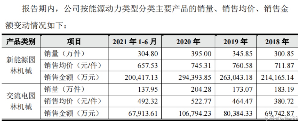 按能源动力类型分类,公司的产品类型可分为新能源园林机械和交流电园林机械。其中,新能源园林机械在2021年上半年实现销售金额20.04亿元(人民币,下同),占两种类型产品总销售额的74.7%。